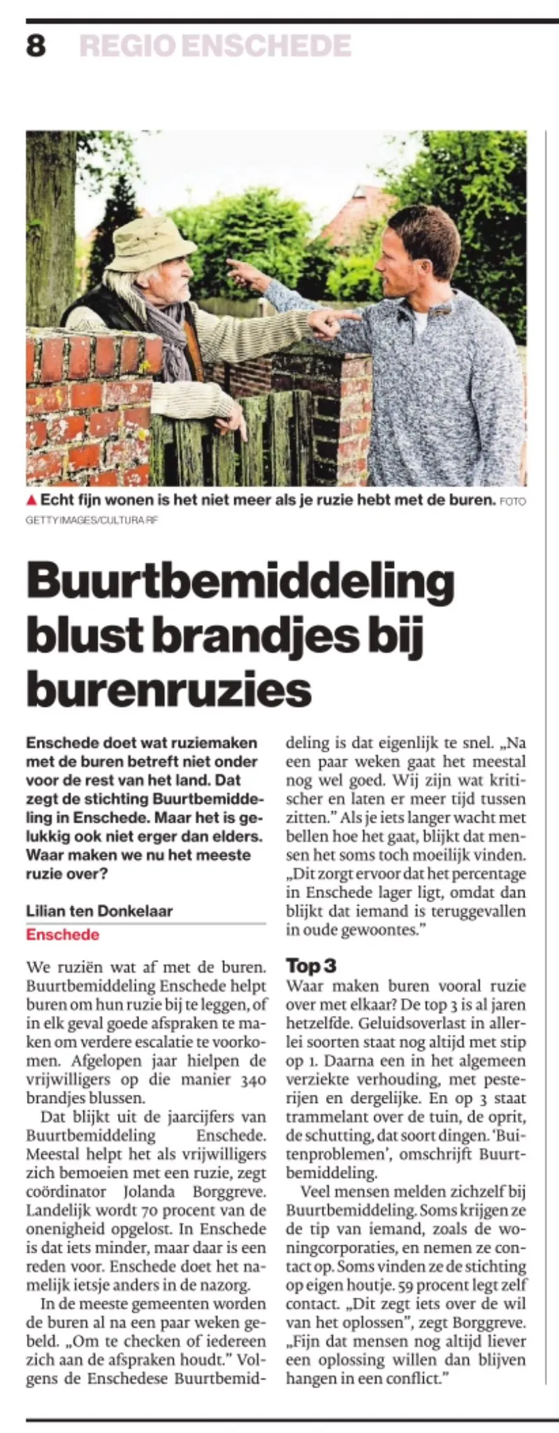 Buurtbemiddeling Enschede helpt buren om hun ruzie bij te leggen, of in elk geval goede afspraken te maken om verdere escalatie te voorkomen. Afgelopen jaar hielpen de vrijwilligers op die manier 340 brandjes te blussen. Dat blijkt uit de jaarcijfers van Buurtbemiddeling Enschede.
